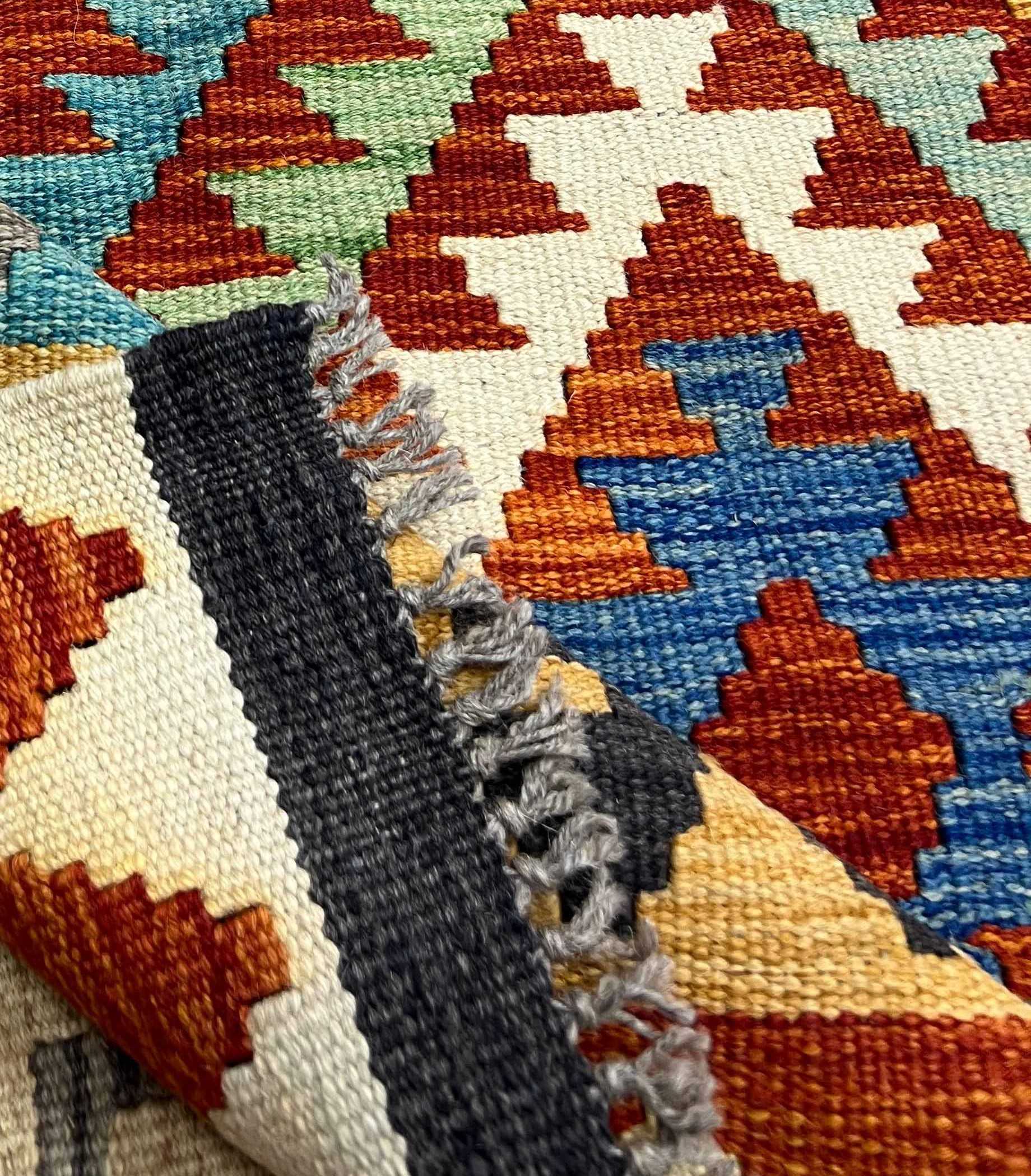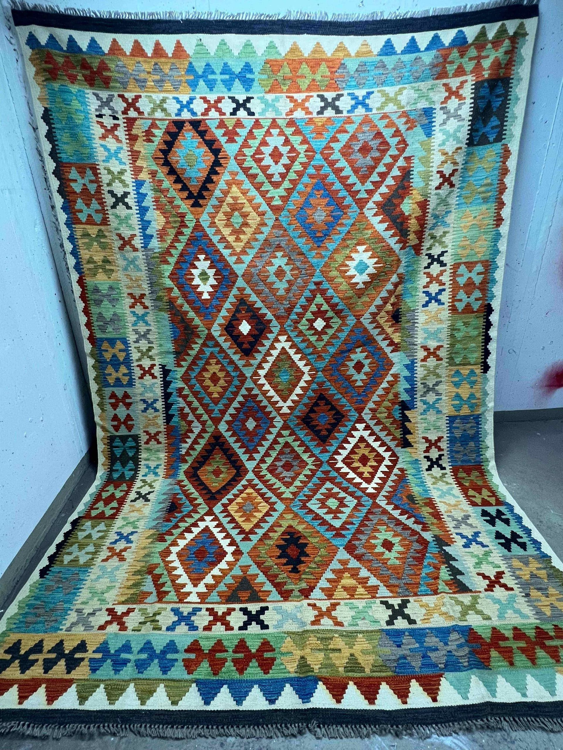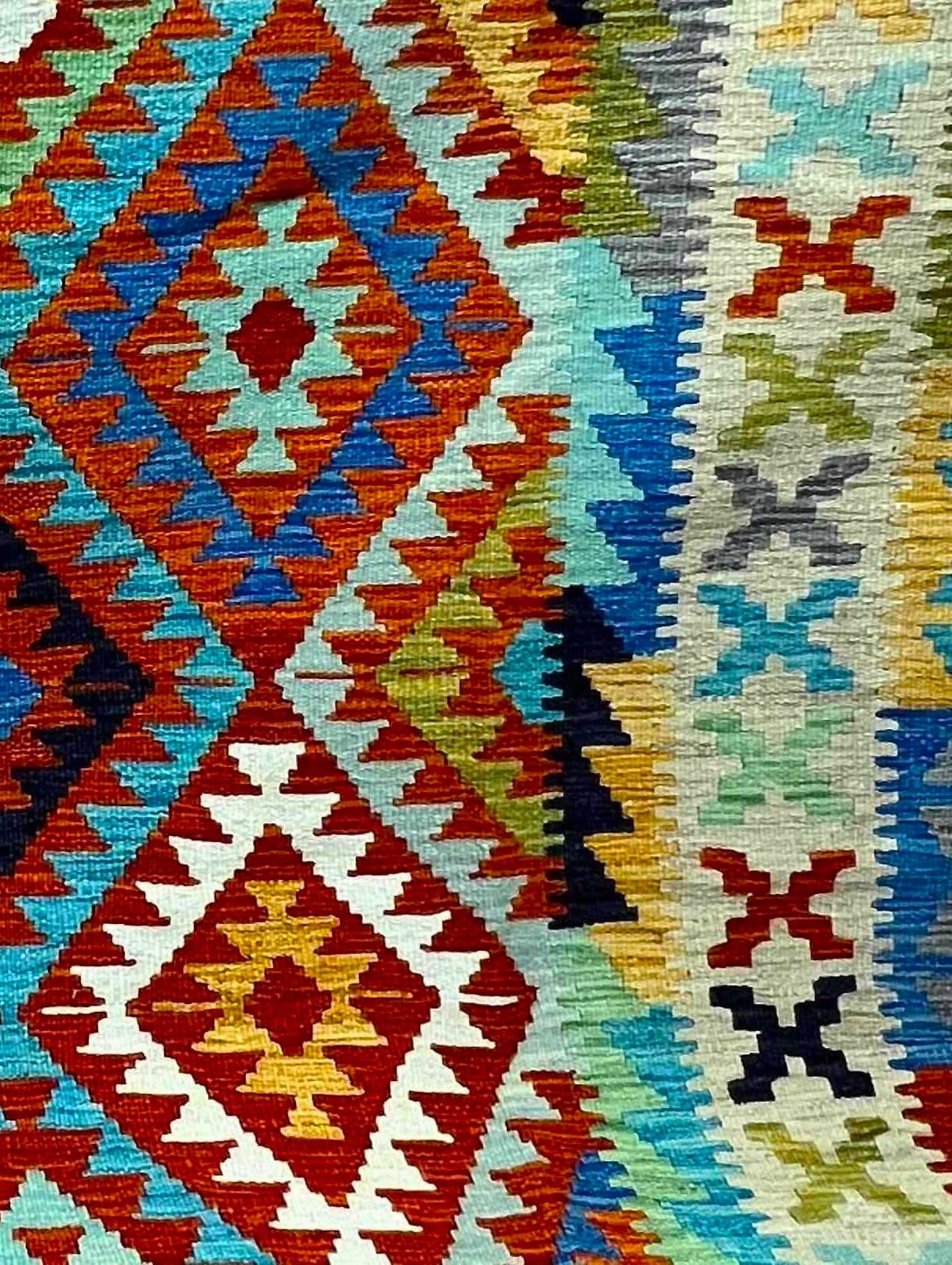 This Afghan handmade kilim is a striking blend of tradition and artistry, featuring a rich turquoise base accented with red and deep maroon diamond motifs. Carefully handwoven by skilled Afghan artisans, the flatweave design showcases bold geometric patterns that reflect centuries-old tribal heritage. Lightweight yet durable, this kilim is ideal for living rooms, dining areas, or open spaces where colour and character are desired. Its natural tones and intricate detailing make it a timeless piece that adds warmth, texture, and cultural depth to any interior.