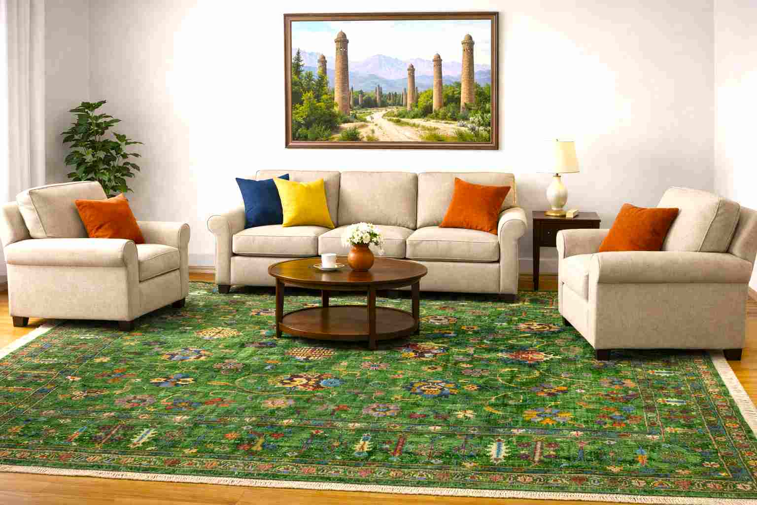Transform your space with this exquisite handwoven carpet, measuring 250 x 175 cm. Its striking Sultani design, set against a vibrant green background, brings life and warmth to any room. Featuring intricate patterns and exquisite details, this carpet is a true work of art.